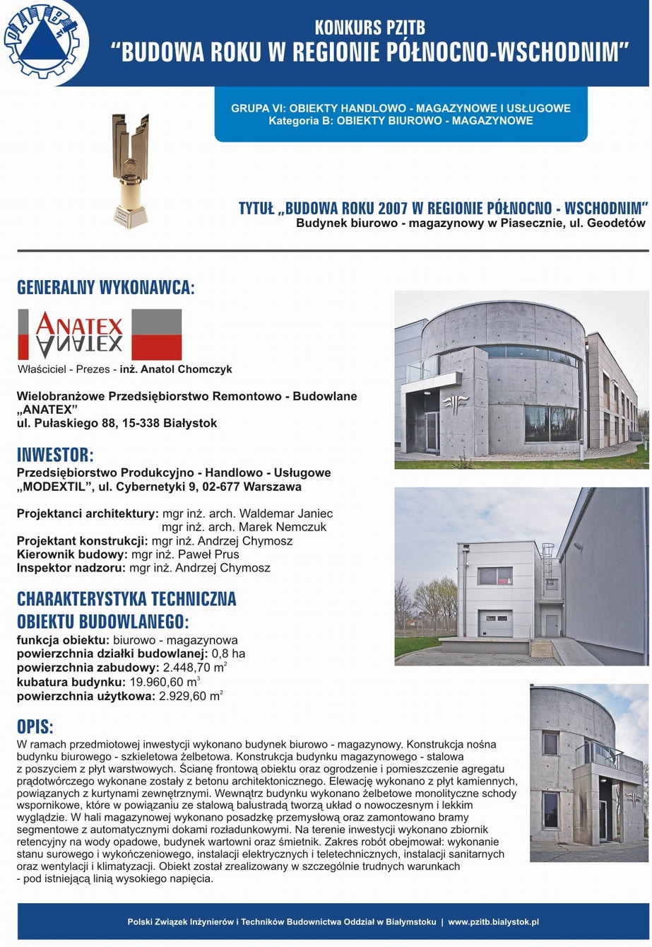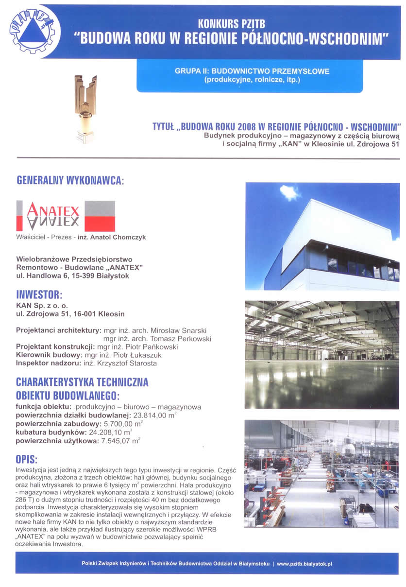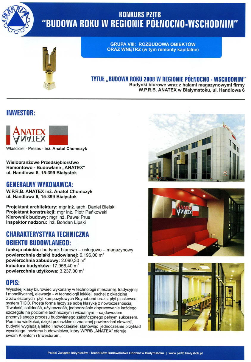 Konkurs organizowany przez Polski Związek Inżynierów i Techników Budownictwa - Oddział w Białymstoku to coroczna ocena najlepszych obiektów budowlanych w naszym regionie. Popularyzuje nowe standardy w budownictwie oraz promuje firmy, które wdrażają nowe technologie i zachowują znakomitą organizację procesu budowlanego. „ANATEX" został wyróżniony w trzec kategoriach:
