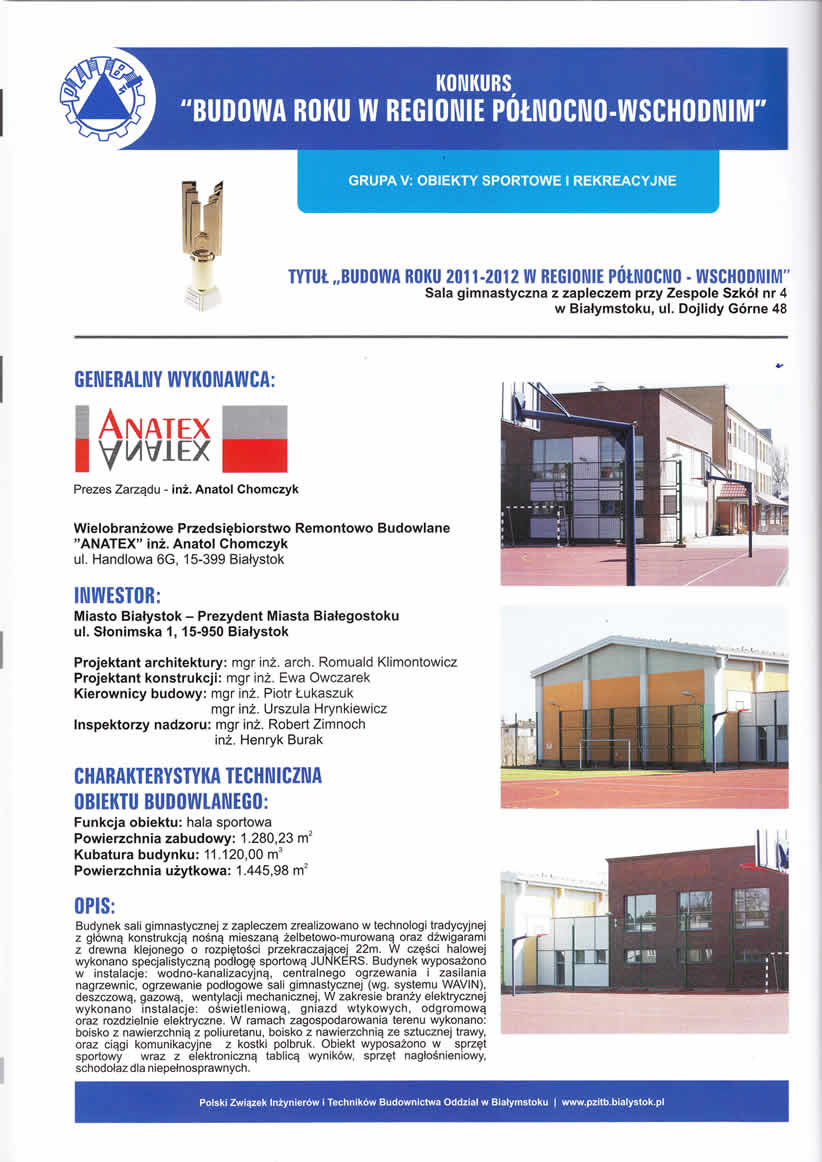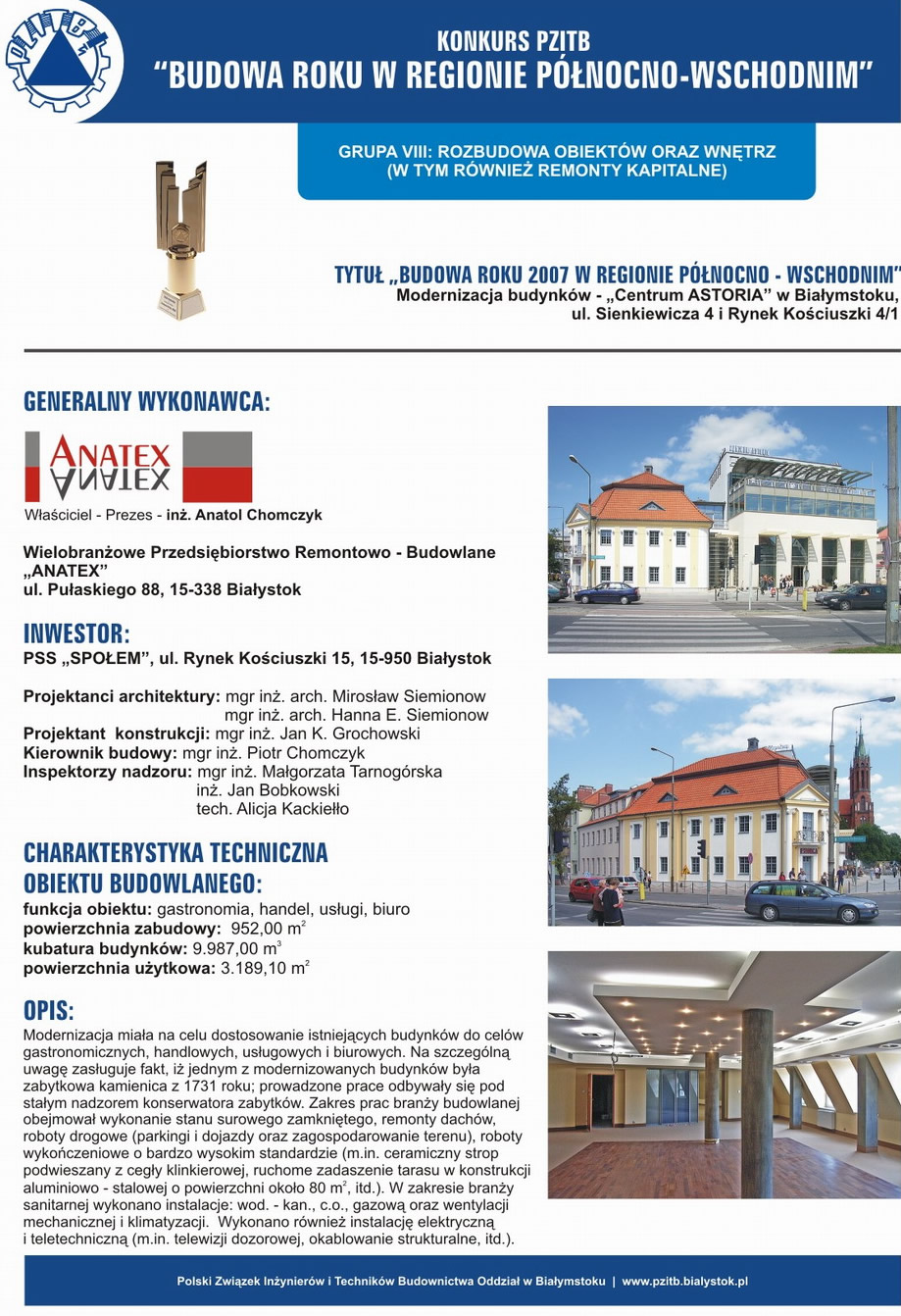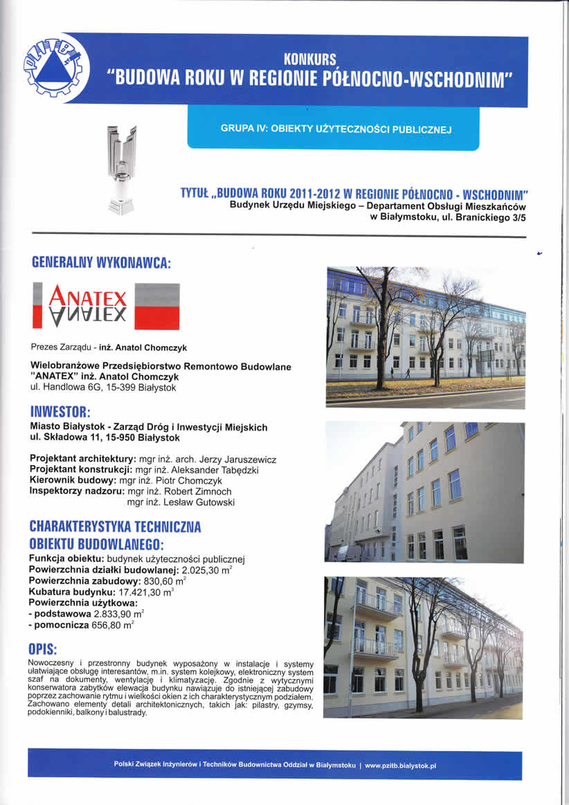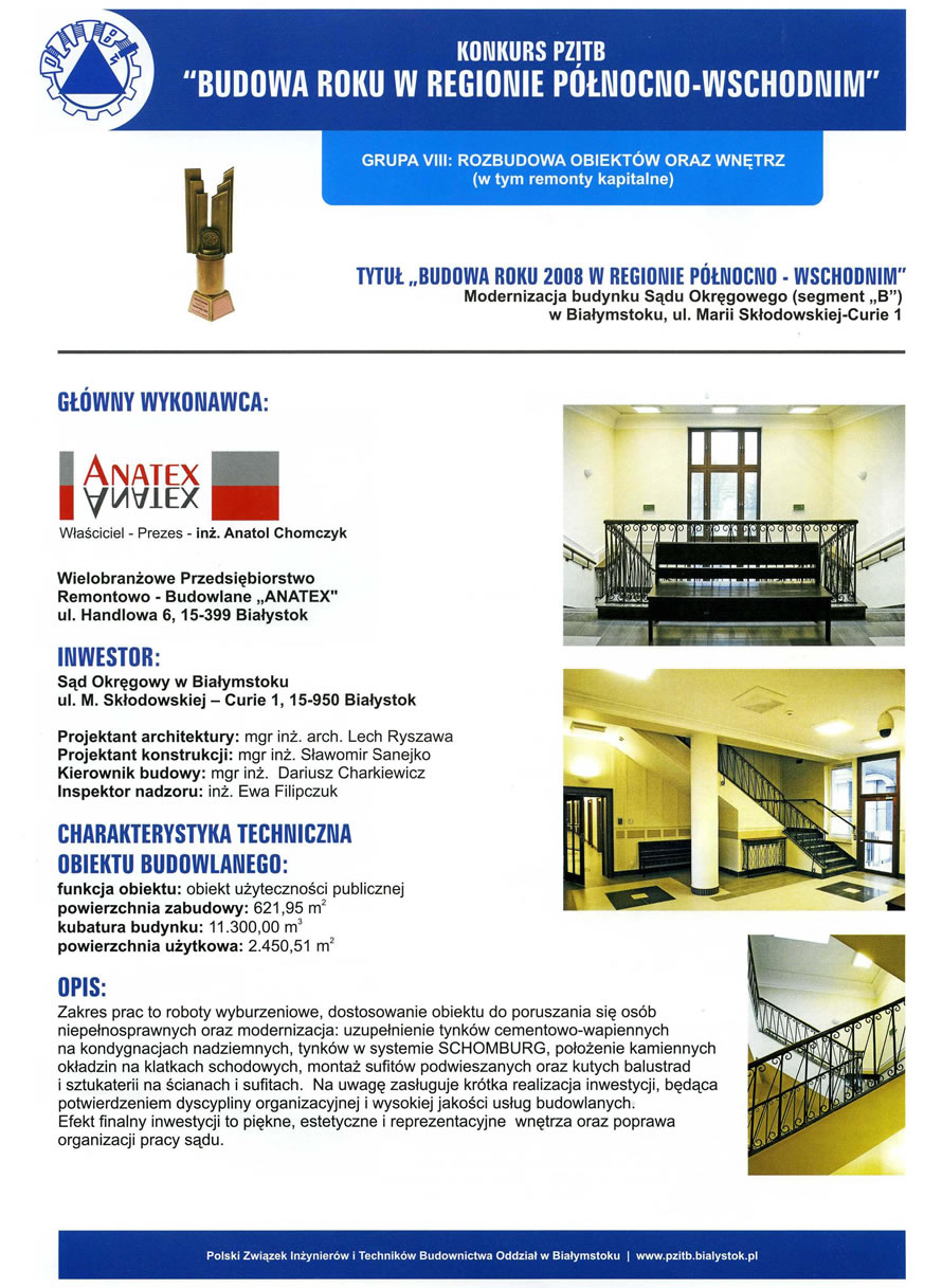 Konkurs organizowany przez Polski Związek Inżynierów i Techników Budownictwa - Oddział w Białymstoku to coroczna ocena najlepszych obiektów budowlanych w naszym regionie. Popularyzuje nowe standardy w budownictwie oraz promuje firmy, które wdrażają nowe technologie i zachowują znakomitą organizację procesu budowlanego. „ANATEX" został wyróżniony w trzec kategoriach: