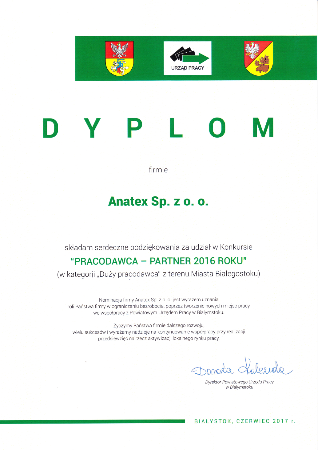 Firma ANATEX Sp. z o.o. otrzymała Dyplom udzału w konkursie Pracodawcy - Partnera 2016 roku w kategorii "duży pracodawca" z terenu miasta Białegostoku. Przyznawany on jest przez Powiatowy Urząd Pracy jako wyraz uznania dla roli firmy Anatex w ograniczaniu bezrobocia poprzez tworzenie nowych miejsc pracy we współpracy z Powiatowym Urzędem Pracy w Białymstoku.